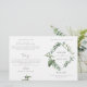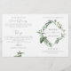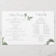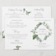 Programa de celebração de casamento com folhas botânicas verdes delicadas, geometria de ouro e texto de caligrafia.
