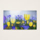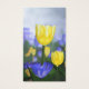 Tulipas amarelas e azuis se destacam em um campo numa legal manhã primavera. À luz do sol, eles se destacam como copos de luz ouro.