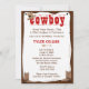 convites de festas de aniversários temáticos do excelente Cowboy para seu caubói favorito. Design tem a palavra Cowboy, chapéu de cowboy e botas de cowboy. O fundo é um padrão de bandana marrom.Use nossa modelo fácil para personalizar com suas informações.