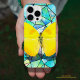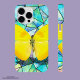 A borboleta amarela brilhante e realista vibrante neon voa sobre os glas geométricos coloridos em gradiente azul.