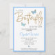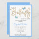 Esta é uma Borboleta Azul e um convite para Chá de fraldas temático Glitter Dourado. Este convite elegante inclui belas borboletas azuis de diferentes tons e uma letra brilhante. Chá de fraldas para a menina, convites para chás de fraldas brilhantes, convites para chuveiros para bebês dourados, Uma borboleta pequena está a caminho!