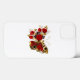 Borboleta de flores de olhos vermelhos, de cor pavão, com asa vermelha texturizada, decorada com a composição de rosas vermelhos pintados artisticamente com caules ouros e folhas sobre fundo branco.