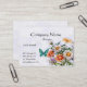Um cartão de visita feminino com um fundo de cores macia salpicadas dos roxos e dos azuis em um fundo branco. Um grupo das margaridas de branco, de amarelo, a laranja e o roxo está no direito, com uma borboleta que obtem pronta para aterrar.
