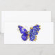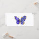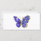 Borboleta de flores cinza, azul, safira, espumante com asa decorada com flores preciosos azuis com folhas de ouro sobre fundo branco.