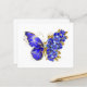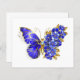 Borboleta de flores cinza, azul, safira, espumante com asa decorada com flores preciosos azuis com folhas de ouro sobre fundo branco.
