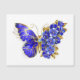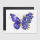 Borboleta de flores cinza, azul, safira, espumante com asa decorada com flores preciosos azuis com folhas de ouro sobre fundo branco.