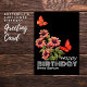Cartão de Aniversário de Borboleta Laranja Vibrante e Girassol - Design preto moderno | Aproxime o dia especial de alguém com este cartão de aniversário impressionante, com borboletas laranja vibrantes a flutuar em volta de um buquê de girassol florescente, contra um fundo negro ousado. Este design moderno e artístico captura a beleza da natureza em detalhes vívidos, fazer-a como um cartão perfeito para celebrar o aniversário de um ente querido. Personalize-o com sua própria mensagem para adicionar um toque sincero. Seja para um amigo, membro da família, ou colega, este cartão tem certeza de se destacar com seu impressionante contraste de cor e sua composição elegante.