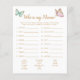 O chá de fraldas de tema da borboleta "quem é minha mãe?" apresenta ilustração de borboletas verdes cor-de-rosa e hortelã com pontas falsas de ouro. Combine o nome do bebê com as mães corretas! Quem tem mais nomes, acerta, ganha! CHAVES DE RESPOSTA: 1.GOOSE=GOSLING, 2.DEER=FAWN, 3.SWAN=CYGNET, 4.ZEBRA=FOAL, 5.KOALA=JOEY, 6.SEAL=PUP, 7.PANDA=CUB, 8.WHALE=CALF, 9.PIGEON=SQUAB, 10.ALLIGATOR=HATLING 11.GORILLA=CRIANÇA, 12.CAT=KITTEN, 13.TURQUIA=POULT, 14.GOAT=KID, 15.FISH=FRY, 16.LLAMA=CRIA