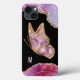 Capas de iphone gráfica com fundo preto e gráficos cor-de-rosa, lavanda e borda decorativa com aspecto brilhante dourado. Gráficos de um belo ouro e borboleta rosa decoram o centro. Personalize o monograma cor-de-rosa de uma letra para satisfazer as suas necessidades.