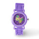 Primeiro relógio de pulso para crianças. Borboleta pintada à mão no centro com números brancos. As mãos têm palavras horas e minutos para ajudar uma criança a aprender a dizer horas. O design do rosto do relógio é mostrado em um relógio roxo divertido com banda correspondente. Há muitos outros estilos para escolher e o design é facilmente transferido para qualquer um deles.