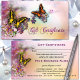 Certificado de presente romântico e artístico com flores, borboletas e efeitos de boque. Você também pode usar este cartão como um cartão de visita normal, excluindo a imagem de texto frontal e personalizando seus textos. Um cartão de visita excelente para uma butique, terapeuta ou qualquer um em um negócio criativo.