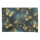 Uma esteira elegante com padrão de borboletas em matizes de ouro e blues brilhantes.