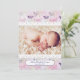 Um anúncio bonito para a sua nova menina apresenta um padrão de borboletas roxas e rosa e um quadro fotográfico com uma falsa borda de renda. Há uma etiqueta branca aparada em roxo para colocar nome e data de nascimento. Informações adicionais podem ser adicionadas às costas, se desejado.
