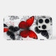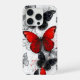 Bando de borboletas voadoras, realistas, vermelhas e pretas em fundo branco com gotas de tinta.