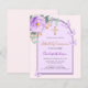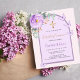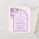 Um fundo cor-de-rosa com um arco. Decorado com um verde roxo, violeta, rosa, verde de eucalipto e borboletas. Personalize e adicione um nome e detalhes. Traseira: cor de fundo cor-de-rosa pincelada.