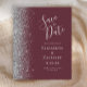 A borda esquerda deste elegante casamento moderno salve o cartão de data apresenta uma borda cintilante. O texto personalizável combina a escrita manual de cinzas prateadas, fontes em copperplate e itálico em um fundo de burlagem escura. O lado inverso apresenta uma burgundy e uma design prateada correspondentes.