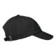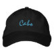 Boné mostrado em preto/azul com texto bordado. Cabo