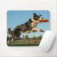 A mousepad featuring a Border Collie in the air with a disc in his mouth on a disc golf course.