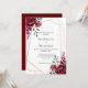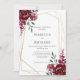 Convite de casamento personalizável em branco limpo. Possui buquês florais bonito em tons vermelhos burgundy marsala, muito ricos, com uma estrutura geométrica de ouro moderna.