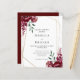 Convite personalizável para casamento de papel de barato em branco limpo. Possui buquês florais bonito em tons vermelhos burgundy marsala, muito ricos, com uma estrutura geométrica de ouro moderna.