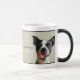Caneca de café com uma Boston Terrier que lambe seus lábios para um copo de Java.
