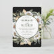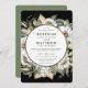 Este belo convite de casamento floral branco e verde apresenta uma ilustração de buquê branco sobre um fundo preto. Os pormenores do convite são escritos em azeitonas com uma borda decorativa verde-oliva. Você pode personalizar este convite elegante com todos os seus importantes detalhes de casamento. O verso apresenta uma estrutura floral coordenada e tem espaço para as iniciais da noiva e do noivo. O presente convite coordena-se com os outros produtos da Coleção de Casamentos Florais Brancos de Botânica.
