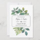 A botânica da safra exibe os detalhes do seu casamento, dispostos exclusivamente em blocos escura e caligrafia, sobre um fundo de folhas de cor verde-d'água pintadas, galhos, samambaias e folhagem. Salve as datas ao contrário do verde de sábio sólido.