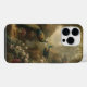 pintura botânica vintage de três pavões num jardim inglês cercado por flores pastel