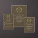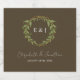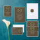 Wedding collection with earth tones of green and dark brown. A gold geometric monogram crest surrounded by botanical leaves.