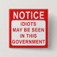 Este crachá de protesto divertido é só o que faz as pessoas rirem. Disponível em outros produtos, este crachá tem a forma de um cartaz e diz: NOTA, IDIOTS PODE SER VISTO NESTE GOVERNO. - Um cartaz político engraçado, que diz o óbvio! Excelente para enviar ao Primeiro-Ministro e a outros políticos. Eu tenho certeza que eles riam!