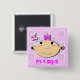 Ele um botão do anúncio da menina que olha uma borboleta.