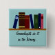 O texto "Genealogistas fazem isso na biblioteca" está escrito abaixo de uma prateleira de livros. Expresse seus interesses na história e na família vestindo este crachá enquanto faz pesquisa.