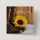 Personalize o encantador Botão de Casamento de Girassol do País com os nomes pessoais da noiva e noiva e data de cerimônia de casamento para criar um presente de manutenção para os recém-casados ou a favor do partido para os convidados. Este bonito e costume botão traseiro do pino de casinha rústico apresenta uma fina fotografia floral de botas de cowboy marrom, girassol amarelo e madeira de celeiro em cetim branco.