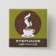Botão personalizado de nome do funcionário ou pino para compradas de café. Cor verde, espresso marrom e branca. Imagem mostra uma caneca de café quente com um gráfico de fundo de grãos de café. Personalize com o nome comercial e o nome do membro do funcionarios. A cor de fundo verde-oliva pode ser alterada para uma cor diferente com a opção Personalizar Ti (Personalizar e, em seguida, selecionar Editar Fundo).