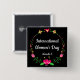 Botão Pinback Personalizado do Dia Internacional da Mulher, 8 de março. Um belo fundo floral negro com a tipografia moderna Dia Internacional da Mulher 8 de março. Celebrar mulheres de todo o mundo. Um presente perfeito para as mulheres vestirem. Parece na moda em chapéus, lapelas, roupas, cachecóis e até bolsas. Você pode personalizar o tamanho e a forma do seu botão.