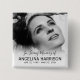 Botão funerário da lembrança com uma foto do seu ente querido perdido, as palavras "em memória amorosa de", o nome das pessoas e as datas de nascimento/morte.