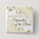 Identifique os principais intervenientes no chá de noiva, casamento ou jantar de ensaio com os nossos elegantes botões de folha falsa dourada. Concebido para combinar com a nossa Coleção de Casamento Folha Dourada, este botão apresenta um floreio de folha falsa dourada num fundo branco com texto dourado que diz Madrasta da Noiva e um espaço para inserir o nome dela. Perfeito como lembrança ou presente para os membros da festa de casamento.