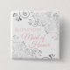 Identifique os principais participantes do seu chá de panela, casamento ou jantar de ensaio com nossos botões elegantes rosa e cinza. Projetado para combinar com nosso conjunto de casamento elegante rosa e cinza, este botão apresenta um floreio prateado em foil falso sobre um fundo branco com texto rosa escrito "Dama de Honra" e um espaço para inserir o nome dela. Perfeito como lembrancinha ou presente para os membros da comitiva nupcial.
