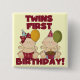Gêmeos, T-shirts de primeiro aniversário, fatos-chave, ímanes, cartas, posters, guardas e mais com um bebê e gêmeos em chapéus de festa e balões e texto com a seguinte redação: "Twins Primeiro Aniversário!".