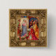 Botão quadrado com uma imagem de um trabalho de arte da Bíblia da Virgem Maria, José, e Jesus bebê e os três sábios que vieram visitar em um quadro de ouro ornamentado. Veja chaveiro e colar de metal grande e alto quadrado. Veja a coleção inteira de botões e pinos de feriado nos TOUCHES ESPECIAIS | Seção Favoritos para festas.