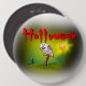 Esta imagem diz Halloween em vermelho. O fantasma tem um sorriso no rosto e está flutuando sobre a paisagem com o sol no fundo. A bruxa está voando sobre a vassoura. Esses botões vêm em uma variedade de quadrados e redondos, com a rodada entrando em uma variedade de formas e tamanhos.
