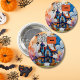 🎃 Botão de Halloween do Partido Fantasma Personalizado - Adicione diversão festiva a qualquer evento! Este design tocável apresenta fantasmas de desenho animado adoráveis em chapéus de bruxa, coroas e chapéus de pirata com uma casa assombrada brilhante, abóboras, morcegos e teias de aranha. Personalize com seu próprio texto, nome ou mensagem para torná-lo único para eventos escolares, festas de sala de aula, noites de truque ou de tratamento, festivais comunitários ou qualquer celebração do Dia das Bruxas. Um design bonitinho, não muito assustador que é perfeito para crianças e adultos!