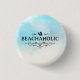 O botão apresenta aquarela praia água areia e a palavra "Praia Viciada" com sotaque decorativo e chinelos.