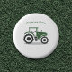 Um botão com uma ilustração de um trator verde e cinza no estilo de desenho animado! Uma boa ideia de presente para um fazendeiro, uma criança ou uma família rural!