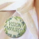 Anuncie as suas necessidades especiais com este crachá bonito de duro de audição de JessicaAmber! Possui o slogan 'Visão Imparada' em uma fonte estreita, cercada por uma coroa verde de folhas, sobre um fundo verde-claro. Você pode editar o texto conforme necessário. Um presente de excelente para o membro da sua família que é parcial ou totalmente cego. ⭐ Para obter mais acessórios úteis sobre imparidade, visite minha loja Zazzle.com/JessicaAmberArtist ⭐ Para pedidos personalizados, envie-me uma mensagem no Zazzle