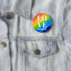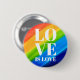 Este Botão do Orgulho é decorado com LOVE IS LOVE em letras brancas em negrito sobre um fundo arco-íris de cor d'água de vermelho, laranja, amarelo, verde, azul e roxo. Original Watercolor © Michele Davies.