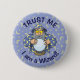 Um velho feiticeiro com capa azul olhando para a bola mágica de cristal.