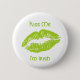 Botão redondo com uma imagem de lábios verdes e barulhentos e o texto "Beije-me, sou irlandês" em letra Celta verde limão. Ver chaveiro de metal de grande valor quadrado. Veja a Rua inteira. A coleção de Botões e Pinos do Dia de Patrick nos TOUCHES ESPECIAIS | Seção Favoritos para festas.