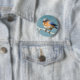 Botão redondo com um design digital de um bluebird oriental em uma luz - ramo cinzento da parte traseira do pino.