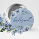 Pino de Chá de panela azul de Bridesmaid no botão. Apresentando lindas elegantes ardentes ardentes ardósias flores azuis de cor aquática num fundo azul tábico claro. Veja os outros botões correspondentes na coleção para outros convidados importantes como a madrinha de casamento, noiva a ser, dama de honra e muito mais!